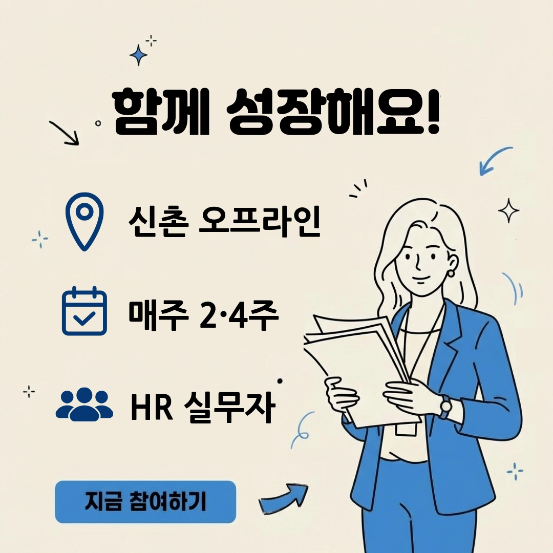 HR에 관심 있는 누구나 환영합니다! 인사팀 재직자, HR이 궁금한 직장인, 기업 대표님, 취업준비생까지 모두 참여 가능해요. 업무 중 궁금한 점은 언제든 단톡방과 오프라인 모임에서 질문해 주세요.